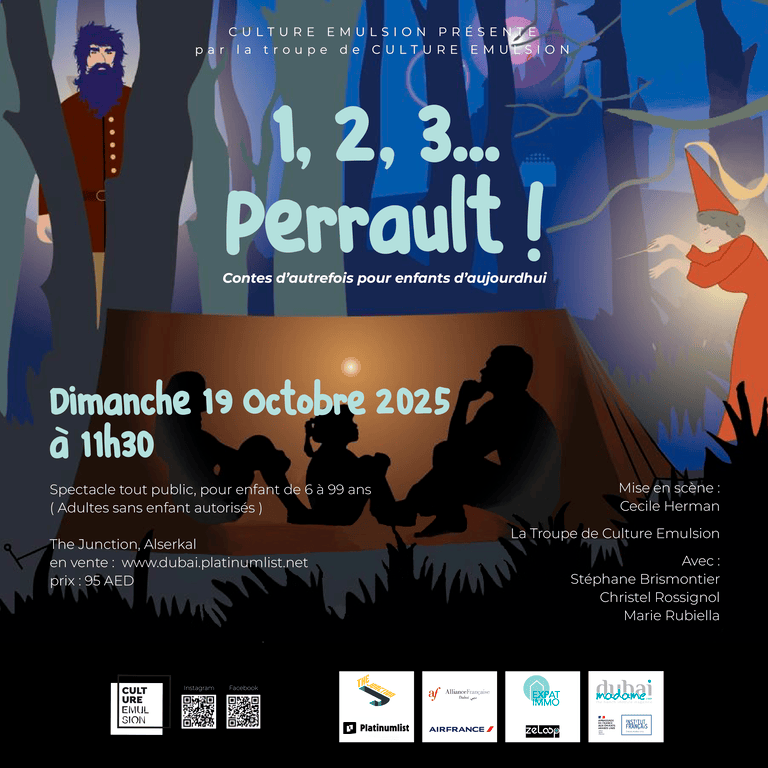 French Description: Pour les 10 ans de Charlie, fan des contes de Perrault, ses parents organisent une chasse au trésor dans la forêt. Accompagnée de sa petite soeur Emilie et de son grand frère Max, munis de leurs téléphones portables et puces GPS, les trois enfants se lancent dans l’aventure tout en se chamaillant. Deux épreuve étonnantes sur le Petit Chaperon Rouge et Barbe Bleue… mais en route vers la troisième épreuve, ils se perdent et vont faire la rencontre de personnages de contes : ogres, fées, Prince, princesses! Les trois enfants se retrouvent au coeur du Petit Poucet, de Cendrillon, de la Belle au Bois Dormant! Pour s’en sortir, ils vont devoir combattre les dangers des contes de Perrault, découvrir leur talentpersonnel, et la force de leur amour. 1, 2, 3 PERRAULT at The Junction in Dubai at Unit H72, Alserkal Avenue, 17 St. Corner 8 St, 1 17th St, القوز, دبي, United Arab Emirates events Shows and Theatrical Plays The Junction