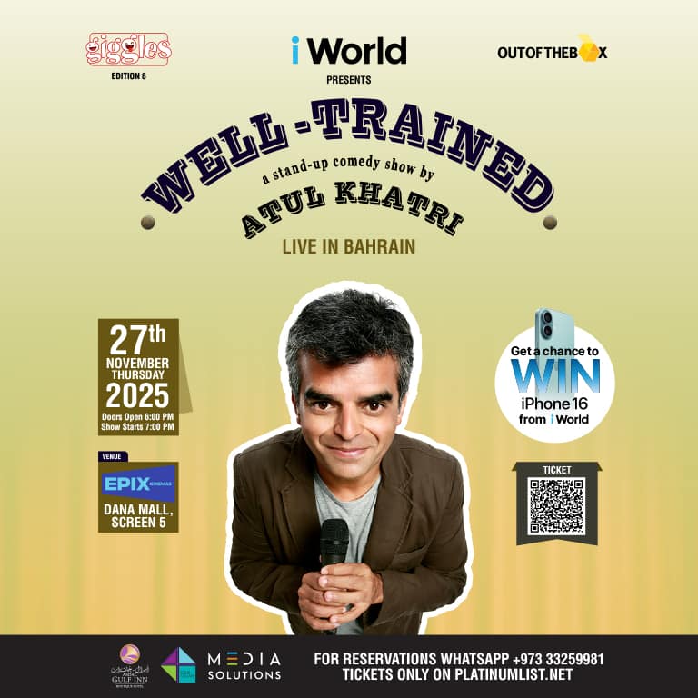 Mark your calendars for Thursday, 27th November 2025 at EPIX Cinemas, Dana Mall – Screen 5. Doors open at 6:00 PM and the show kicks off at 7:00 PM sharp. Organized by Out of the Box and supported by Media Solutions, this is a comedy event you don’t want to miss. Don’t miss the chance to see one of India’s top comedians live—get your tickets now and prepare for a night filled with giggles and good vibes! Prepare yourself for a hilarious evening as Giggles Edition 8 proudly showcases Well-Trained, featuring India’s top comedian, Atul Khatri, live in Bahrain!