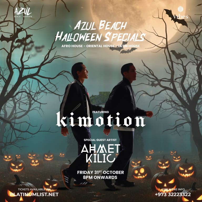 But the magic doesn’t stop there—Bahrain proudly welcomes back the renowned DJ and producer Ahmet Kilic, a multi-genre veteran celebrated for his high-energy sets and non-stop vibes. Known for seamlessly blending afro-house, Latin house, and progressive house, Ahmet will keep the dance floor alive till the early hours. And don’t worry if you don’t have a costume—our professional face painter will be on site to spook you up and get you in the Halloween spirit. This is your chance to experience an unmissable night of music, mystery, and pure beachside magic! Get ready for the Best Halloween Beach Vibes as we transform the shore into a spooky, creepy, and electrifying celebration like no other! For the very first time in Bahrain, the sensational French duo Kimotion will take the stage, bringing their signature afro house productions and oriental blends that have earned them worldwide recognition. With trending afrohouse hits like Shik Shak Shok, Dana Dana, Becane and more, their performance promises to deliver a hauntingly unforgettable night of global rhythms and thrilling energy under the stars. But the magic doesn’t stop there—Bahrain proudly welcomes back the renowned DJ and producer Ahmet Kilic, a multi-genre veteran celebrated for his high-energy sets and non-stop vibes. Known for seamlessly blending afro-house, Latin house, and progressive house, Ahmet will keep the dance floor alive till the early hours. And don’t worry if you don’t have a costume—our professional face painter will be on site to spook you up and get you in the Halloween spirit. This is your chance to experience an unmissable night of music, mystery, and pure beachside magic! Azul Beach Halloween Specials Featuring Kimotion & Ahmet Kilic at Azul Beach Bahrain events Halloween Azul Beach Bahrain Kimotion