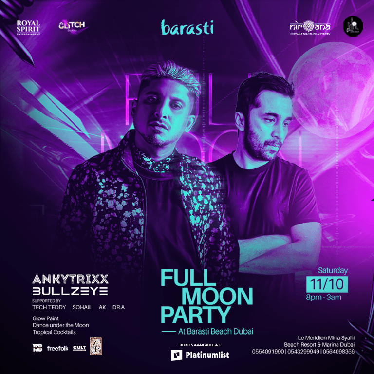 . Full Moon Party at the Barasti Beach Dubai Under the Full Moon – An Epic Night Awaits! Featuring 2 International Headliners: Ankytrixx | Bullzeye