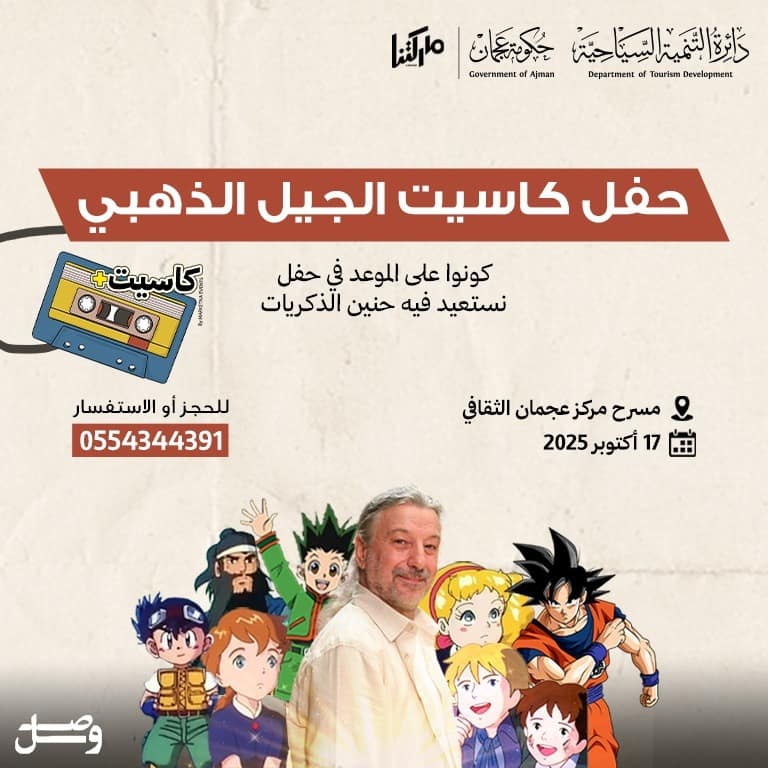 – Enjoy a night to remember as the golden generation gathers with the original singer of Spacetoon songs! Together, we’ll sing the beloved cartoon theme songs from our childhood with the wonderful artist Assem Sukkar. We look forward to welcoming you to this unforgettable evening, brought to life by Assem Sukkar, as we relive the magic of our childhood cartoon songs, Spacetoon Melodies. Presented by Marketna Events with the official sponsorship of the Ajman Department of Tourism Development. Golden Generation Cassette Concert | Cassette Event + in Ajman at CF7W+9XR, University Street, Near Khalifa Hospital, Al Jerf, Ajman, United Arab Emirates events Concerts Ajman Culture Center