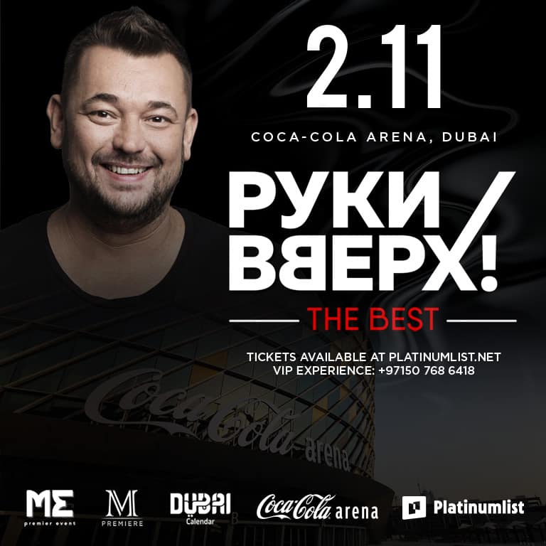 – РУКИ ВВЕРХ! в Дубае – и это будет мощно! 2 Ноября 2025 года, на сцене Coca-Cola Арены прозвучат «Крошка моя», «Студент», «18 мне уже», «Он тебя целует» и все все все песни, которые давно стали больше, чем просто хиты. Каждый трек — это воспоминания о первой любви, школьных дискотеках, постерах на стенах и кассетных магнитофонах. VIP-места – только по запросу Горячая линия: +971 50 768 6418 RUKI VVERH! / РУКИ ВВЕРХ! in Dubai at Coca-Cola Arena, Dubai, United Arab Emirates events Concerts Coca-Cola Arena Ruki Vverh / Руки Вверх!