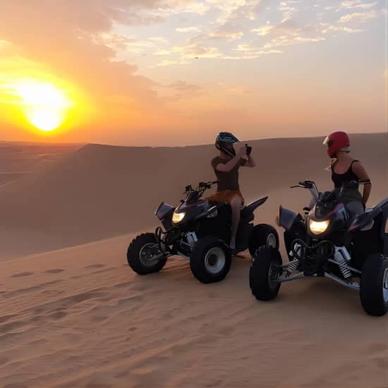 Smartphone tickets ⚡ Instant access to your tickets ⏳ Duration: up to 1 hour Available in Hindi, English Rev up your engines for an exhilarating one-hour quad bike adventure as the sun dips below the horizon! Delve into the heart of the desert, where you’ll witness stunning sunset vistas and tailor the ride to match your pace. This private tour ensures it’s just you, your crew, and the open sands, guided every step of the way. Get your tickets for Sunset Quad Bike Tour Dubai! Highlights Stunning sunset views in the heart of the desert. Tailored quad biking adventure, perfect for any skill level. Exclusive desert exploration at the magical sunset hour. What’s included? ✔️ Bottled water to keep you hydrated during your adventure. ✔️ Quad bike 400 cc automatic for an exhilarating ride. ✔️ A guide to assist you in the desert on another quad bike. ✔️ Helmet for your safety. ✔️ Experience the beauty of the desert and a stunning sunset view. ✔️ Instruction at the beginning on how to use the quad bike in the desert. Additional Information ♿ Wheelchair users will find this experience fully accessible, including transportation options and all areas and surfaces. Infants and small children can comfortably join in a pram or stroller. Service animals are welcome to accompany their owners. Nearby public transportation options make arriving and departing convenient. ❌ Travelers with spinal injuries and pregnant travelers are advised against participating. ️♂️ This activity is suitable for guests of all physical fitness levels. Why choose Fever? ✔️ Millions of users book every month. ✔️ The best prices and availability at all times. ✔️ Thousands of unique experiences. ✔️ Verified user reviews. ✔️ 24/7 customer service. Experience supplied by big red Desert Picnics & Camping Organizing .Co All ticket sales are final and cannot be refunded, exchanged, or otherwise modified. Click here to check out the T&Cs . Sunset Quad Bike Tour Dubai (Deep desert ride , sunset in desert) at BIG RED MOTOR BIKE RENTAL, Dubai, United Arab Emirates
